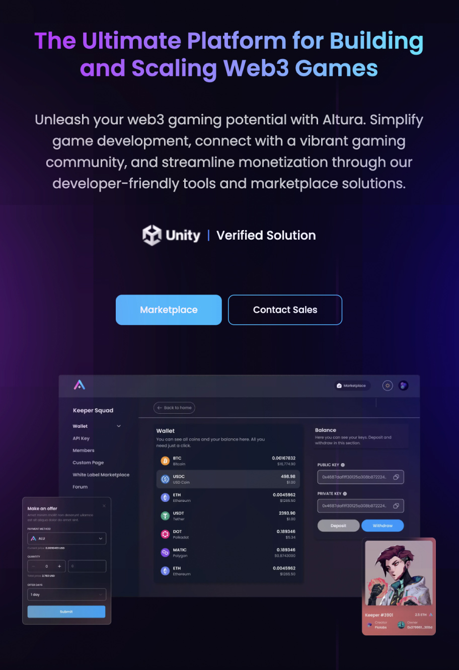 Altura makes it easy to build, scale, and monetize Web3 games. Altura’s API and SDKs allow you to create, update, and transfer NFTs in-game without technical complexity or costly investment. Their built-in authentication tools secure your NFT economy, simplify user enrollment, and instill trust in your player base. And with the help of Altura’s marketplace solutions, you have the flexibility to sell your NFTs on a thriving marketplace or create your own custom, branded storefront with their white label solutions.